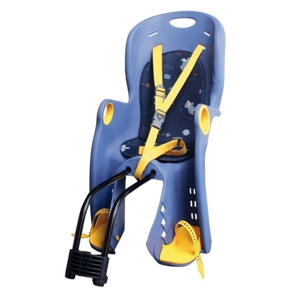 Vaaleanharmaa istuin, jossa musta pehmuste Soveltuu 9-22 kg lapsille 9 kuukadesta 6-vuotiaille asti Helppo asentaa pyörään, jonka runko koko 26″-28″ Mukana runkokiinnike Säädettävät turvayö ja jalkatuet